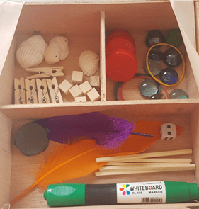 בקופסת עץ יהיו חפצים שאינם קשורים זה לזה באופן ישיר. מספר החפצים וסוג החפצים יבחרו על ידי הגננת, ויוצגו באופן אחיד לכלל הילדים. החפצים יכולים להגיע מהטבע, להיות מתועשים או גם וגם. ניתן להוסיף לחפצים בובות אצבע.