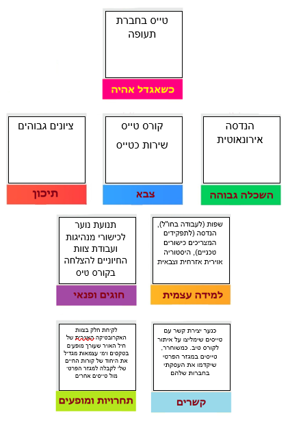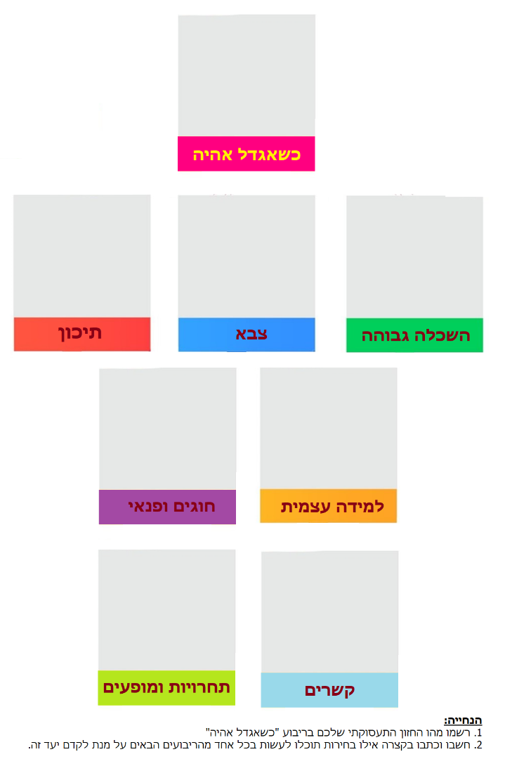 הנחו את התלמידים לחשוב על כל פרקי חייהם, לא רק על פרק החיים הנוכחי שלהם כתלמידים, אלא גם על העתידיים (חייל, סטודנט וכד') ואילו מעשים יוכלו לעשות בכל פרק חיים בכדי לקדם את חזונם המקצועי.